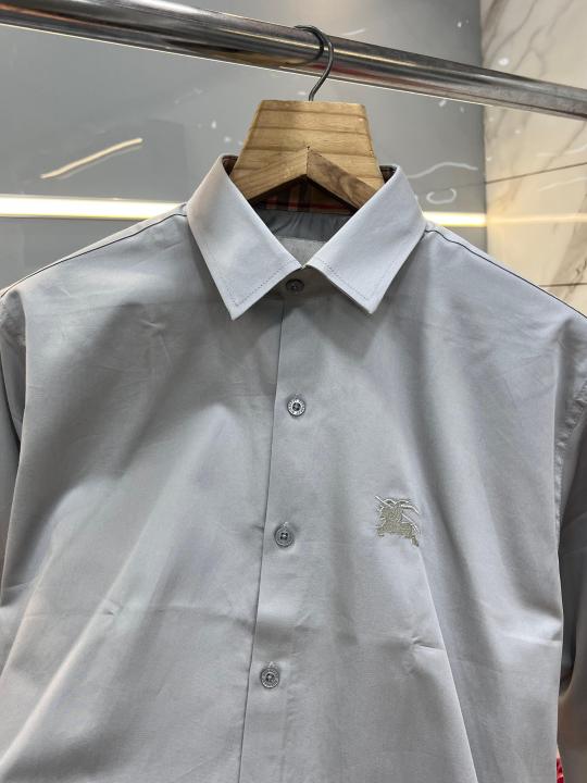 Burberr y Grey Premium Embroidered Logo Cotton Lycra Fabric Shirt With custom Branded Button Tagging And Brand Packing 3410